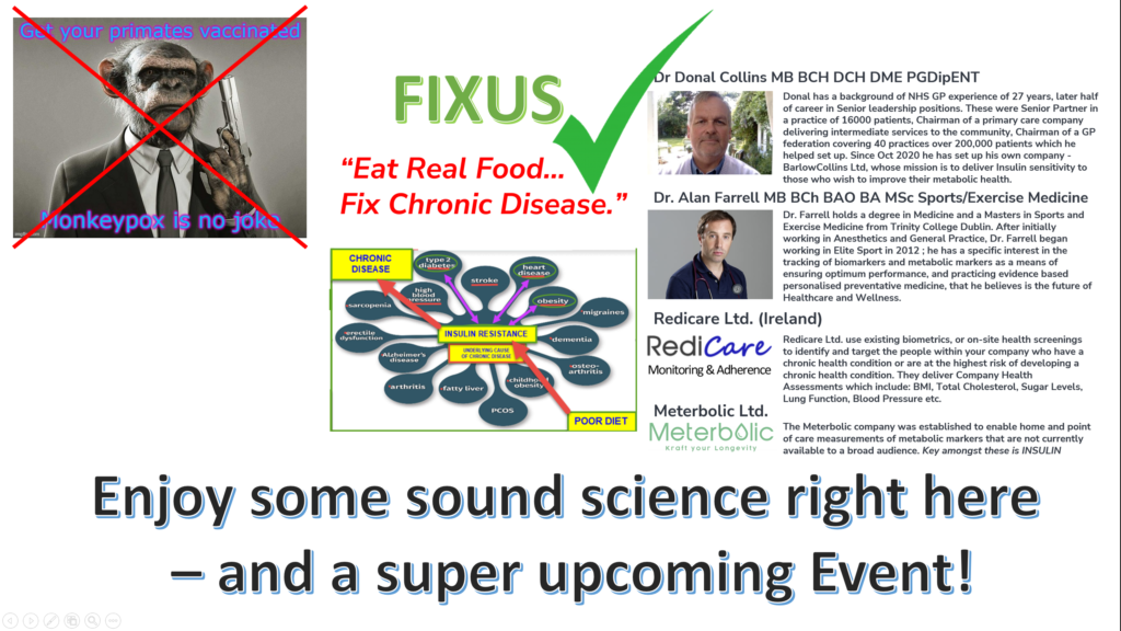 Heads up short vid on up on some real population health progress – can jump to 00:01:15 for the juicy science, see short vid below! So forget the latest media MoneyPox circus for a bit, and focus on the real deal – anyone within driving distance of our Wicklow venue can book here for a great day and super-valuable test results – and the BEST Weight Loss advice! : https://www.eventbrite.com/e/health-event-insulin-cholesterol-testing-and-health-talks-qas-tickets-342633304437